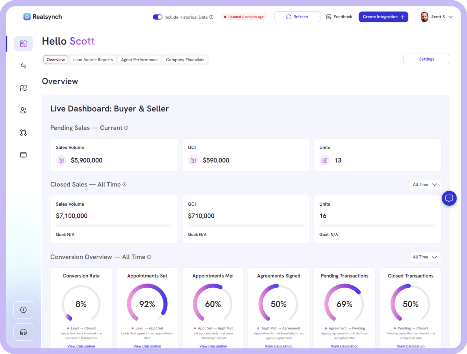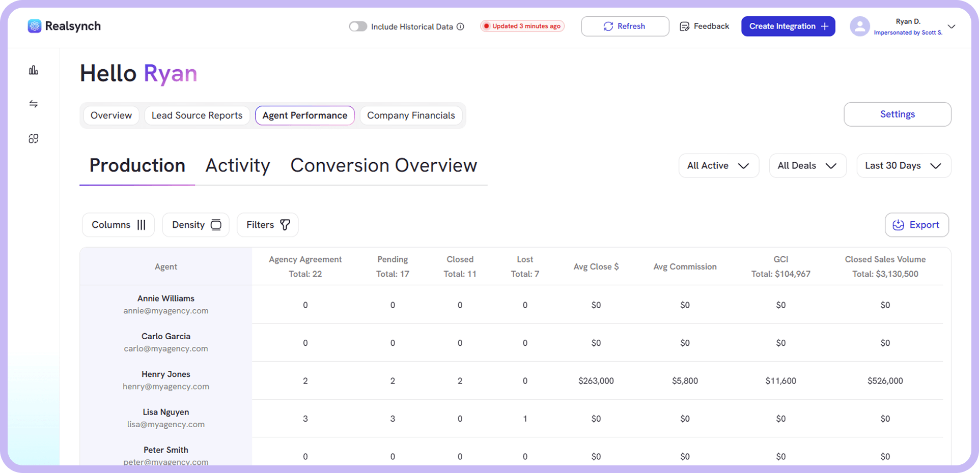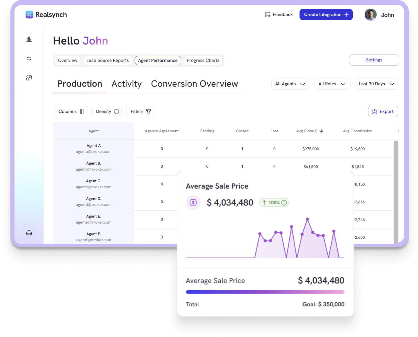 See who’s performing and who’s not. Realsynch automatically pulls in an agent’s dial attempts, call time, contacts, appointments set, won/loss conversion rates, contract executions, and closings.
